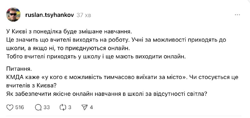 Кабінет Міністрів України рекомендував усім закладам освіти тимчасово перейти на дистанційний формат навчання. Таке рішення обумовлене безпековою ситуацією та тривалими повітряними тривогами через масовані атаки.