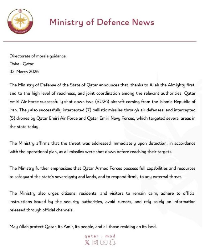 Військово-повітряні сили Катару заявили про збиття двох іранських винищувачів у своєму повітряному просторі. Цей інцидент стався на тлі загальної масштабної дестабілізації в регіоні після повідомлень про загибель верховного лідера Ірану.