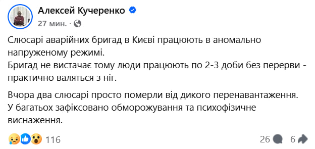 У столиці зафіксовано масштабні перебої в роботі мереж теплопостачання. Понад 400 житлових будинків наразі перебувають без опалення, а ще у 1100 будівлях відсутнє гаряче водопостачання через аварійні ситуації.