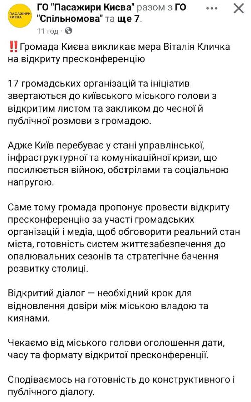 Низка громадських організацій столиці направила колективне звернення до мера Києва Віталія Кличка. Активісти вимагають прозорості у прийнятті рішень щодо міської інфраструктури та стратегічного розвитку громади.