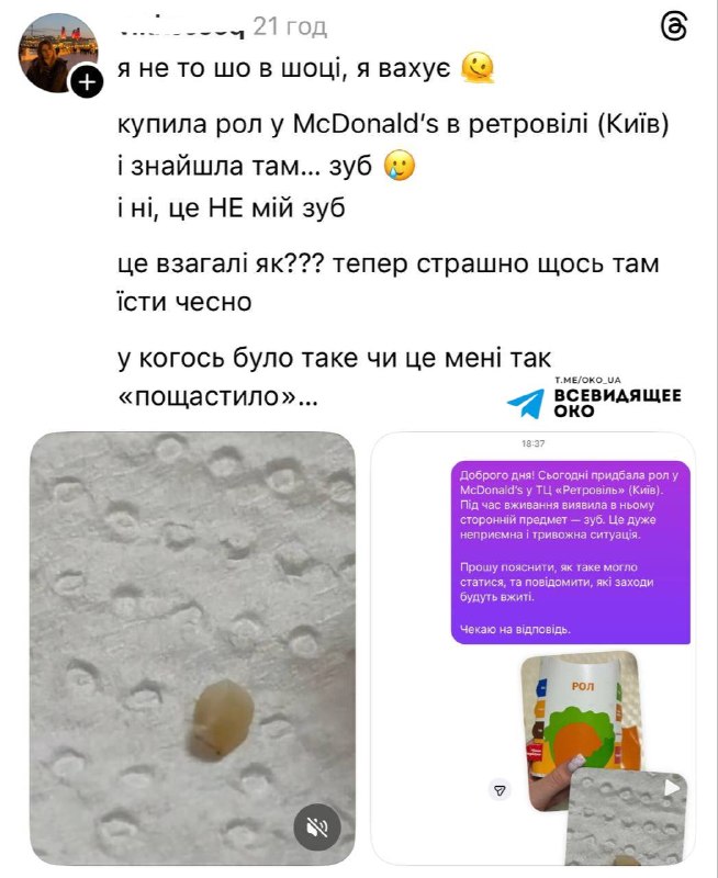 У ролі з McDonald's у Києві дівчина знайшла людський зуб 🦷