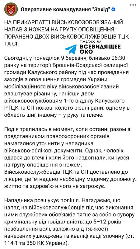 На одному з блокпостів стався збройний напад на представників територіального центру комплектування. Громадянин України застосував холодну зброю проти військових під час виконання ними службових обов'язків.