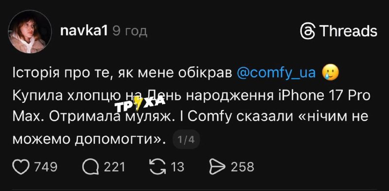 У мережі набула розголосу історія дівчини, яка замовила новітній iPhone 17 Pro Max у відомій мережі магазинів електроніки Comfy. Ситуація викликала значний резонанс серед користувачів через неочікувані обставини отримання або комплектації замовлення.
