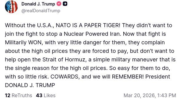 - 🤷♂️НАТО — це боягузи, паперовий тигр, — Трамп. В...Труха Україна • 3/20/2026, 01:47 PM