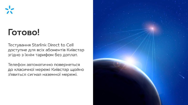 Найбільший український оператор мобільного зв'язку Kyivstar оголосив про старт випробувань технології Direct to Cell від компанії SpaceX. Ця розробка дозволяє звичайним смартфонам, що підтримують стандарт LTE, з'єднуватися безпосередньо із супутниками Starlink.