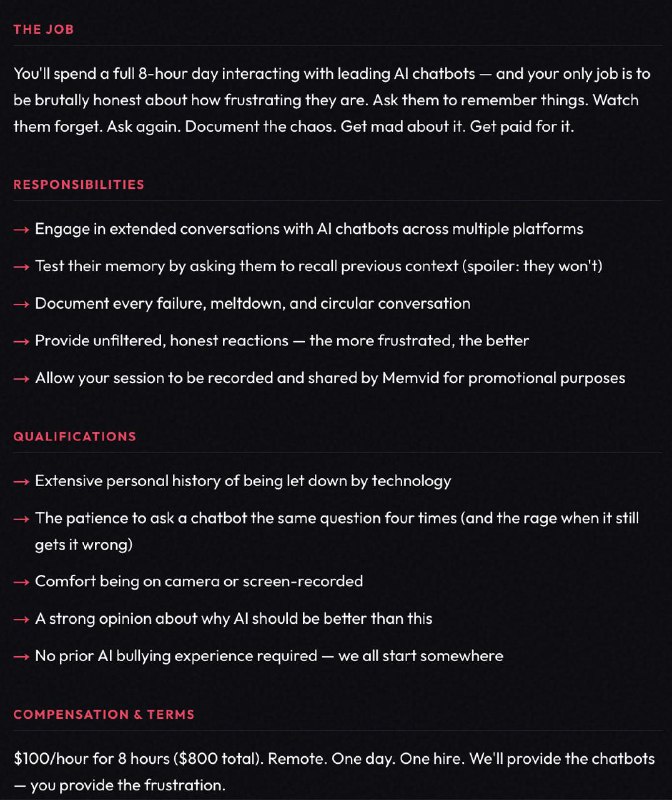 За таку «емоційну» роботу пропонують досить високу винагороду — 800 доларів за зміну тривалістю 8 годин. Це фактично $100 за годину, що робить вакансію однією з найбільш високооплачуваних у сегменті ручного тестування даних. Робота спрямована на виявлення прогалин у здатності ШІ розпізнавати та блокувати токсичний контент у різних контекстах.