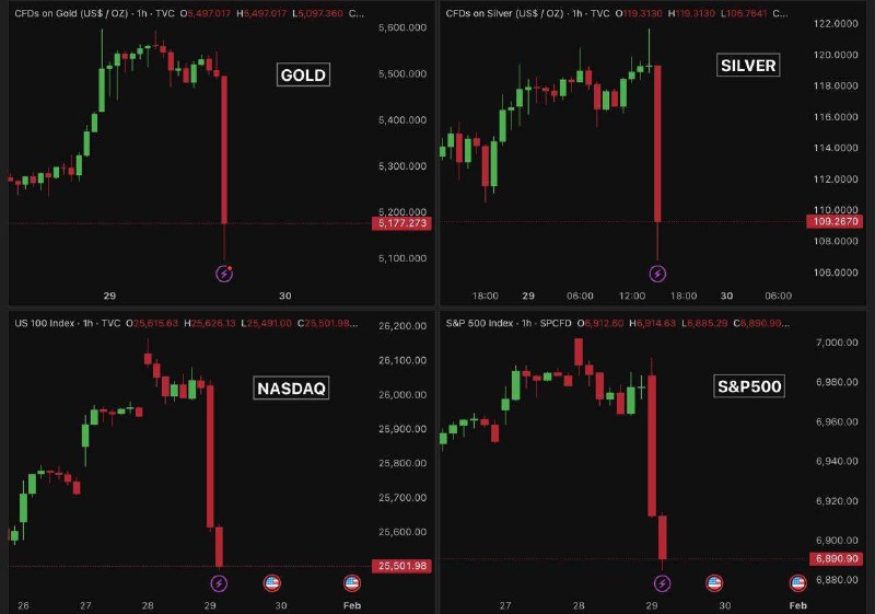 Світова фінансова система зіткнулася з безпрецедентним шоком, оскільки ключові активи продемонстрували стрімке падіння протягом лічених хвилин. За даними аналітичних звітів, сумарні втрати інвесторів у золоті, сріблі та на ринку акцій перевищили позначку в 6 трильйонів доларів США всього за одну годину торгів.