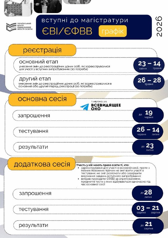 Для певних спеціальностей, зокрема юридичних, економічних та управлінських, обов'язковим залишається складання Єдиного фахового вступного випробування (ЄФВВ). Реєстрація на іспити проходитиме у визначені терміни через електронні кабінети вступників, що має спростити подачу документів в умовах воєнного стану.
