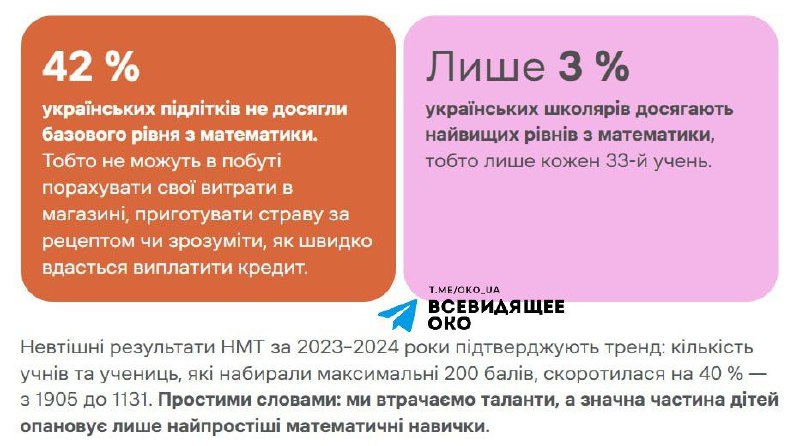 Результати останніх освітніх моніторингів свідчать про глибоку кризу в рівні підготовки українських школярів. Згідно з даними, близько 42% підлітків не володіють математичними компетенціями на базовому рівні, що може мати довгострокові негативні наслідки для економіки країни.