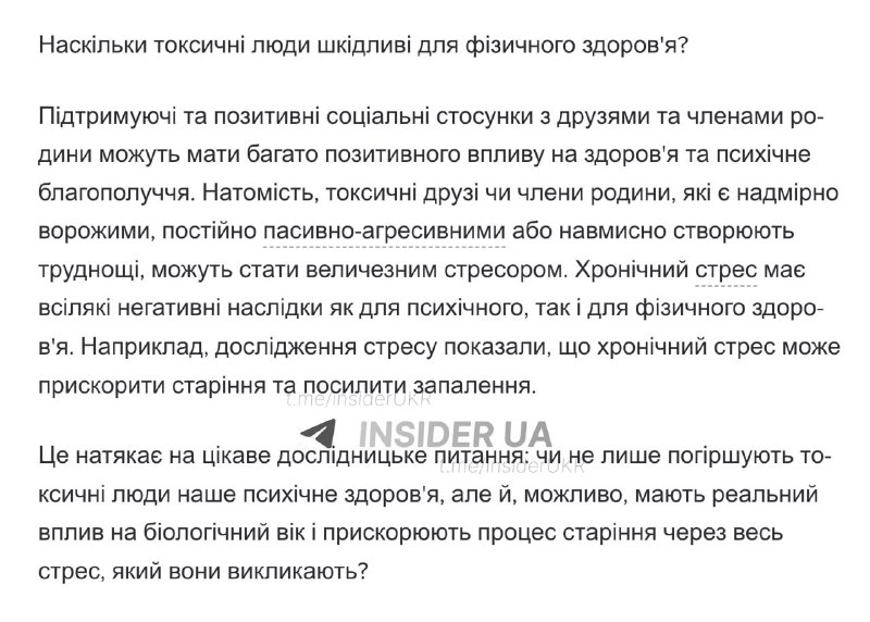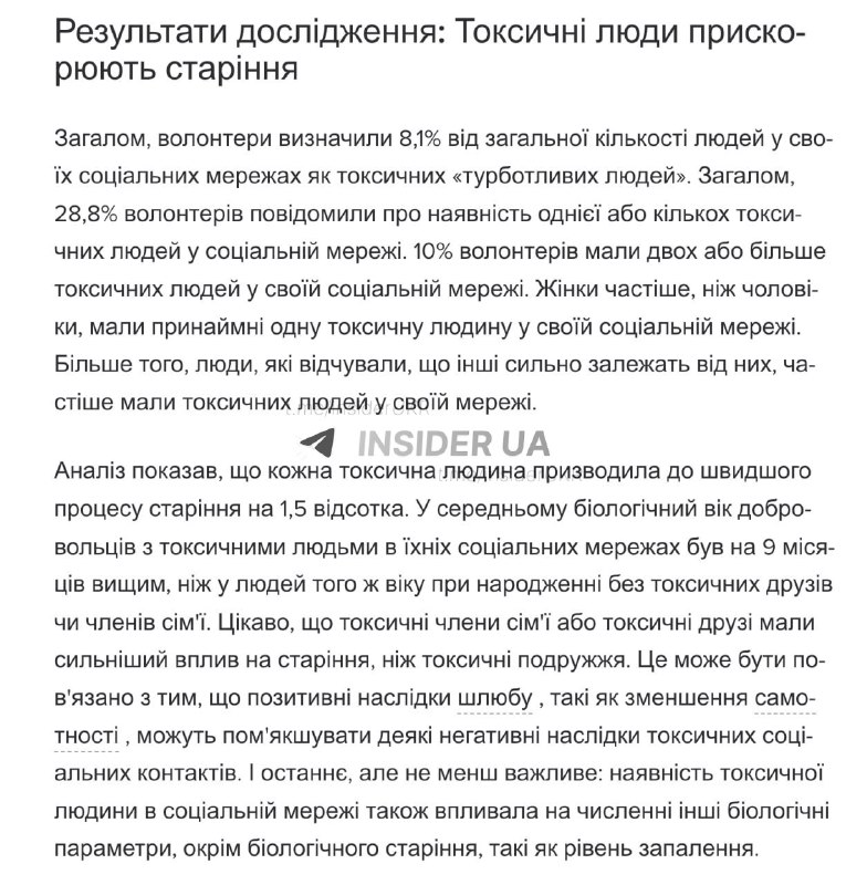 Вчені провели ґрунтовне дослідження, яке доводить, що соціальне оточення безпосередньо впливає на тривалість життя та зовнішній вигляд людини. Згідно з результатами, тривале перебування в контакті з «токсичними» людьми — тими, хто постійно критикує, маніпулює або провокує конфлікти — запускає в організмі механізми передчасного старіння.