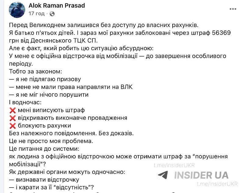 Потерпілий публічно заявив про несправедливість такого рішення, оскільки згідно з чинним законодавством України, статус багатодітного батька надає йому законне право на відстрочку від мобілізації. Він наголошує, що надав усі необхідні документи, проте це не завадило посадовим особам виписати максимальний штраф.