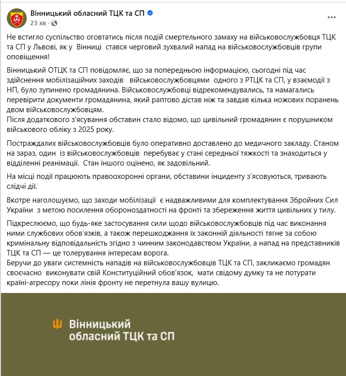 У Вінниці зафіксовано черговий випадок агресії щодо представників територіальних центрів комплектування та соціальної підтримки. Під час здійснення заходів з оповіщення військовозобов'язаних місцевий житель раптово дістав ніж та завдав поранень двом військовослужбовцям. На місце події оперативно прибули екіпажі поліції та медики.