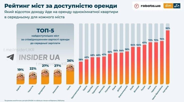- Оренда житла становить 92% від середньої зарплати в Україні.