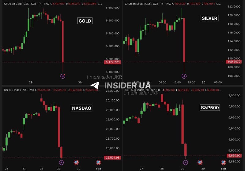 На світових фінансових ринках зафіксовано масштабне падіння котирувань. Протягом однієї години сумарна капіталізація ринків золота, срібла та фондових майданчиків скоротилася на рекордні 6 трильйонів доларів.
