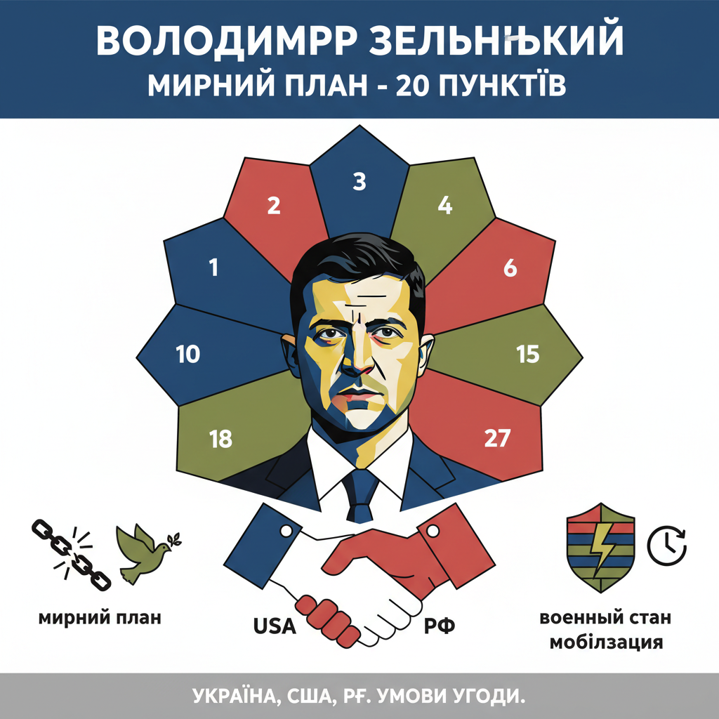Володимир Зеленський розкрив деталі мирного плану, що складається з 20 ключових пунктів. Обговорюються умови підписання угоди між Україною, США та РФ, а також подальший статус воєнного стану та мобілізації.