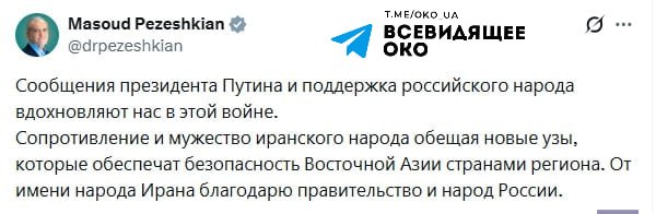 Президент Ірану Масуд Пезешкіан зробив резонансну заяву, зазначивши, що Володимир Путін «надихає» країну в умовах поточного протистояння. Це підкреслює подальше зміцнення військово-політичного альянсу між Тегераном та Москвою на тлі глобальних конфліктів.