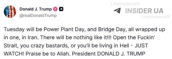 Дональд Трамп у різкій формі закликав Іран негайно відкрити Ормузьку протоку, назвавши дії країни «божевіллям». За попередніми даними, Тегерану дали 48 годин на виконання вимог для запобігання подальшої ескалації.