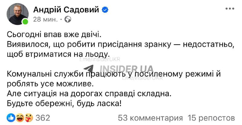 Мер Львова Андрій Садовий повідомив, що сьогодні двічі впав через слизькі тротуари в місті. Він закликав комунальні служби посилити роботу з розчищення вулиць та посипання їх протиожеледними сумішами.