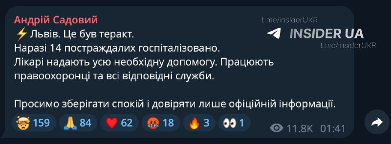 У Львові стався теракт, внаслідок якого госпіталізовано щонайменше 14 осіб. Мер міста Андрій Садовий підтвердив факт атаки, зокрема повідомляється про вибух поблизу будівлі слідчого ізолятора.