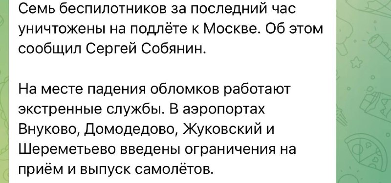 Столиця РФ опинилася під масованою атакою безпілотників, що призвело до запровадження плану «Килим» у московських аеропортах. Повідомляється про численні вибухи та роботу систем ППО в межах Московської області та поблизу летовищ.