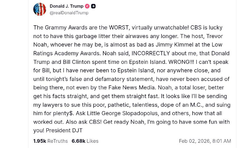 Колишній президент США Дональд Трамп назвав цьогорічну церемонію вручення музичних нагород «Греммі» сміттям. Він висловив невдоволення форматом заходу та ідеологічним спрямуванням виступів артистів.