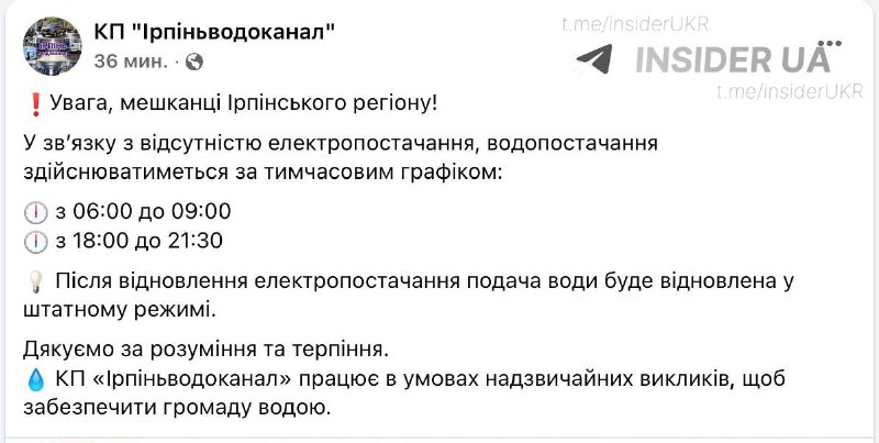 В Ірпені Київської області запроваджують графіки подачі води через складну ситуацію в енергосистемі та дефіцит потужності. Місцева влада змушена вдатися до обмежень водопостачання, щоб забезпечити роботу критичної інфраструктури в умовах відключень світла.