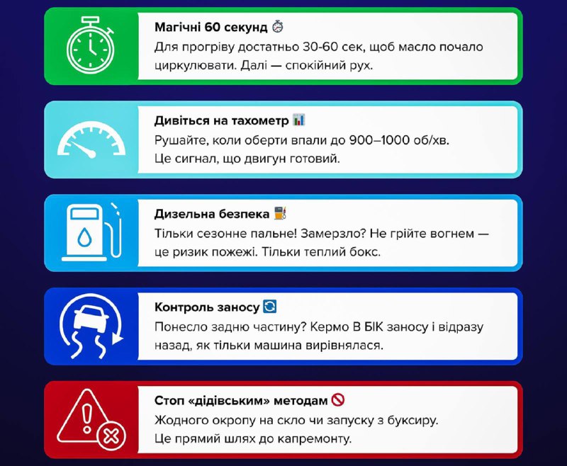 Експерти рекомендують не прогрівати автомобіль довше 30-60 секунд перед початком руху в холодну пору року. Найкращий спосіб підготувати авто до поїздки — плавно рушати з місця після короткої паузи, що дозволяє вузлам рівномірно нагрітися.