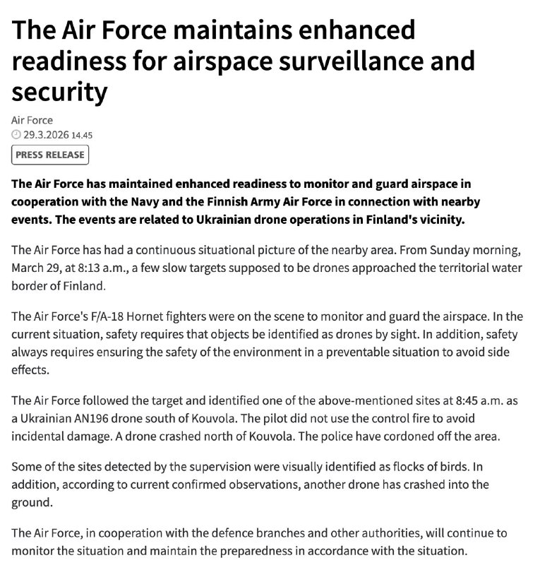 Повітряні сили Фінляндії повідомили про виявлення невідомого літального об'єкта, який порушив повітряний простір країни. Інцидент стався на тлі загального посилення заходів безпеки в балтійському регіоні.