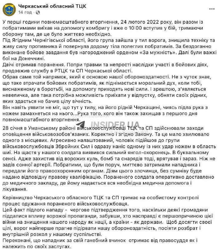 В Умані стався зухвалий напад на співробітника Територіального центру комплектування під час виконання ним службових обов'язків. Місцевий мешканець завдав військовому ножове поранення в шию.