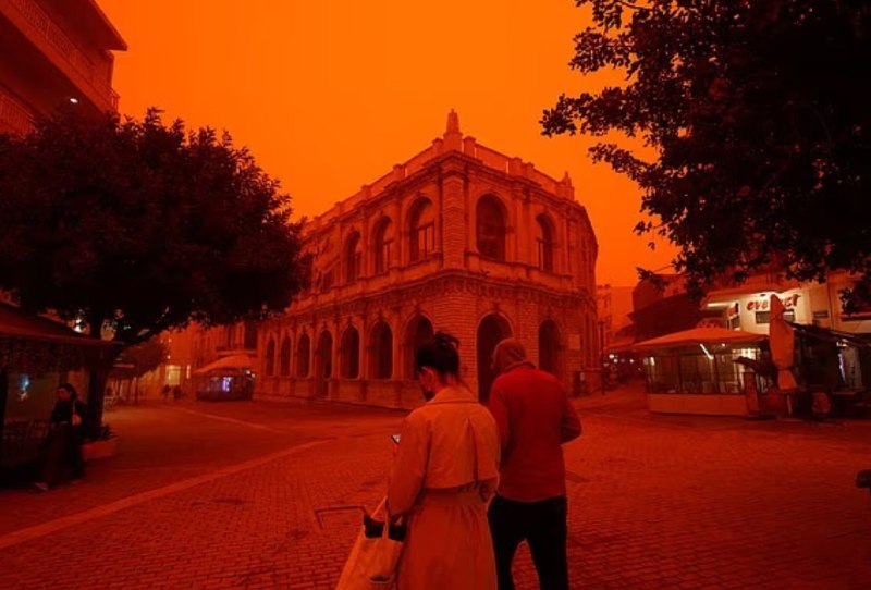 Грецький острів Крит опинився в епіцентрі масштабної пилової бурі, яка прийшла з Африки. Небо забарвилося в інтенсивний червоно-оранжевий колір, а видимість на дорогах значно погіршилася.