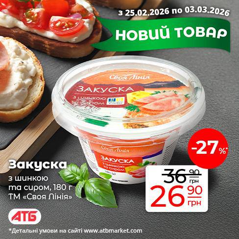 На полицях магазинів АТБ з'явилася нова закуска з шинкою та сиром під власною торговою маркою. Продукт представлений в упаковці вагою 180 грамів і вже доступний для покупців.