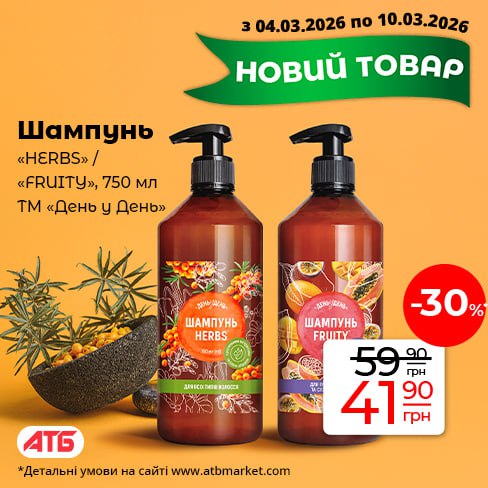 Мережа супермаркетів АТБ представила нову лінійку шампунів під власною торговою маркою у великому об'ємі. Покупцям пропонують серії «HERBS» та «FRUITY», орієнтовані на доступний догляд за волоссям.