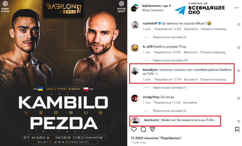 Український боєць змішаних єдиноборств (ММА) Арлі на прізвисько «Камбіло» привернув увагу медіа через участь у поєдинку з бійцем на прізвище Пезда. Подія викликала хвилю іронічних коментарів у соціальних мережах через незвичне поєднання імен суперників.