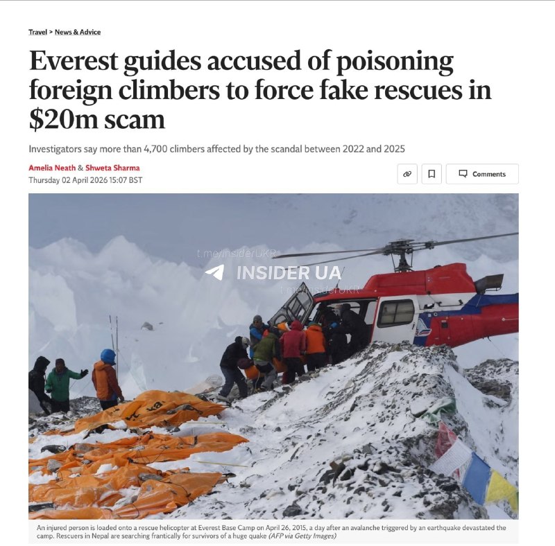 Шокуюче розслідування виявило, що гіди на Евересті навмисно додавали проносні засоби або інші препарати в їжу туристів. Це робилося для того, щоб вимагати екстрену евакуацію гелікоптером, за яку гіди отримували відкати від страхових компаній.